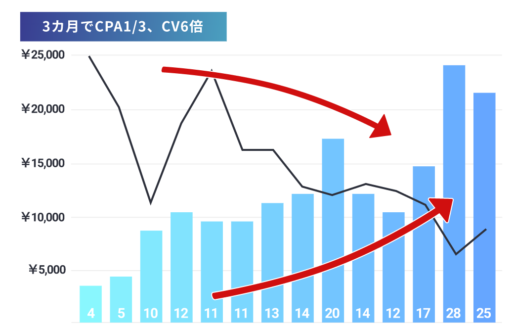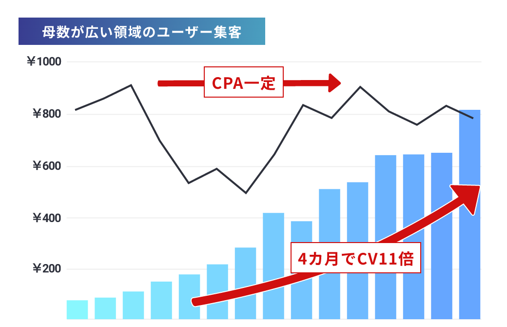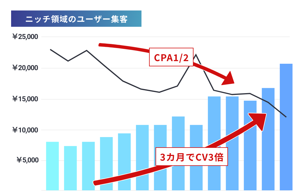 ニッチ領域でも3カ月でCV3倍・CPA1/2、母数が大きな領域でも4カ月でCV11倍に