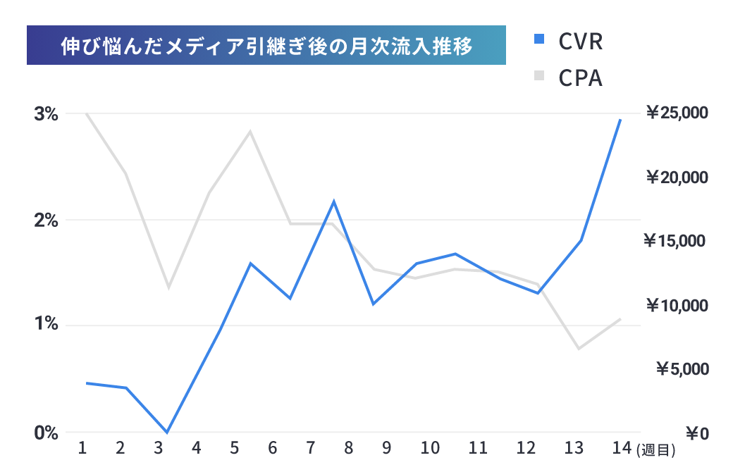 既存の広告代理店様から切り替え後、サイトをリニューアルや広告運用方法の変更を行い、CVRが4倍に、獲得コストが当初の1/2を維持できるような状態に。